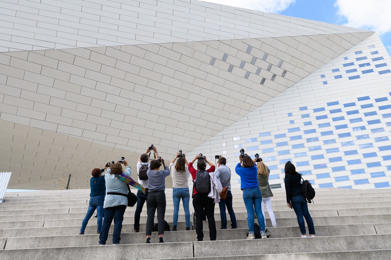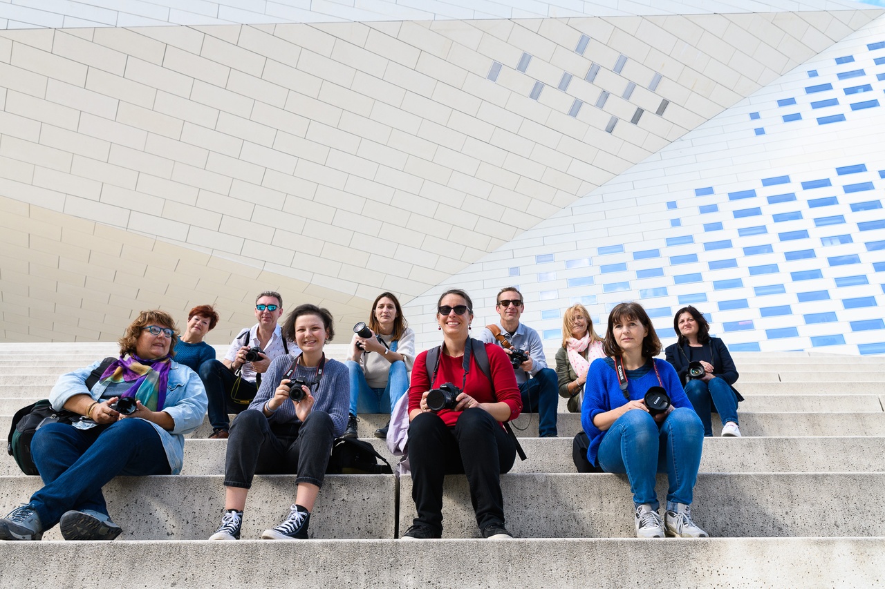 La douzaine de photographes a pu circuler autour de la Méca pour explorer les différents points de vue. La richesse de perspectives du bâtiment offre de nombreuses possibilités. Le lieu était quasiment privatisé puisque peu de monde circulait. Une ambiance parfaite pour bien débuter la prise de vue.