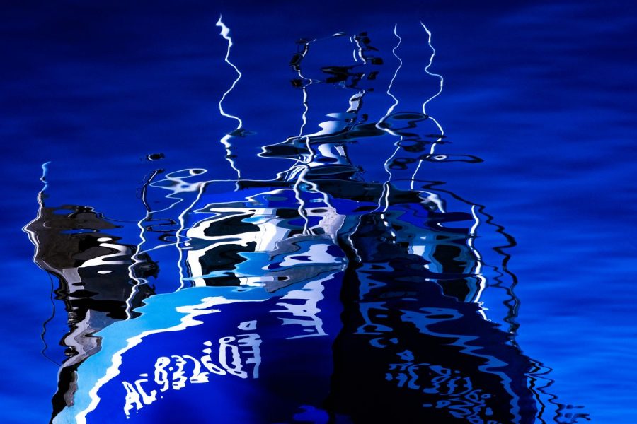 Au bout du ponton est amarré un beau chalutier bleu. La couleur de son reflet dans l’eau  est vive et attrayante. Un plaisancier, dans son embarcation, s’apprête à partir en mer. Son passage déclenche une ondulation à la surface de l’eau venant donner vie au reflet du joli navire bleu.