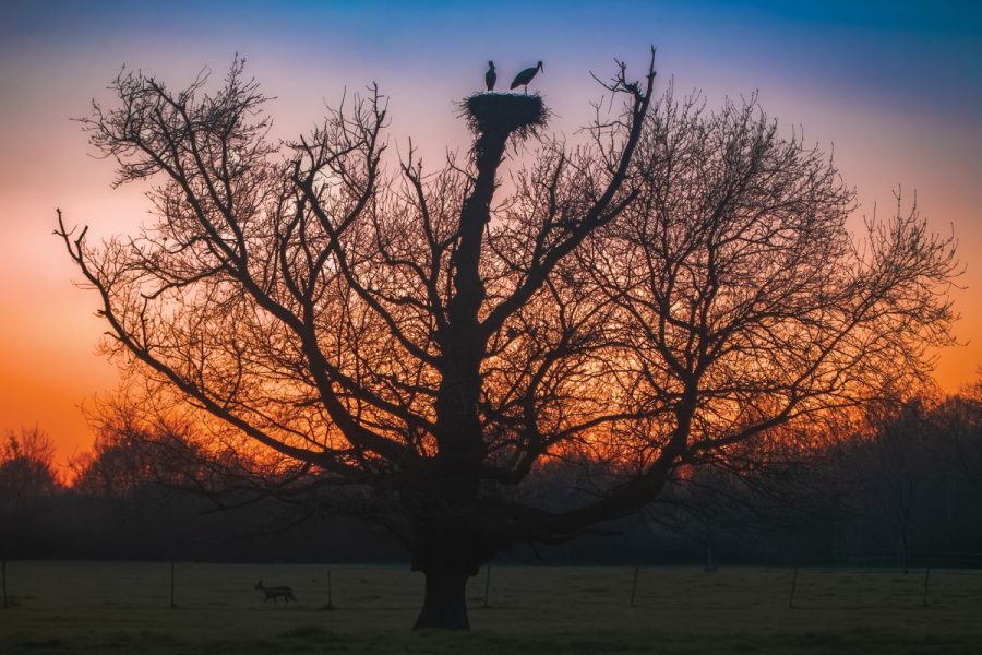 A l’heure où les chiens et les loups ne sont plus vraiment reconnaissables, la vie s’anime autour du grand arbre du pré : le chevreuil est de sortie, les cigognes préparent leur nuit.