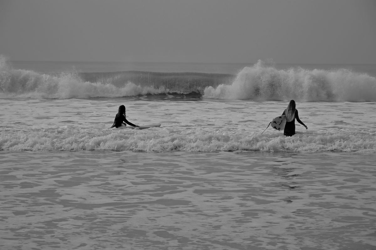 C’était un jour d’hiver, lors d’une promenade sur la plage. J’aperçois ces deux surfeuses courageuses braver le froid de l’eau et de l’air pour aller à la rencontre des vagues océaniques.