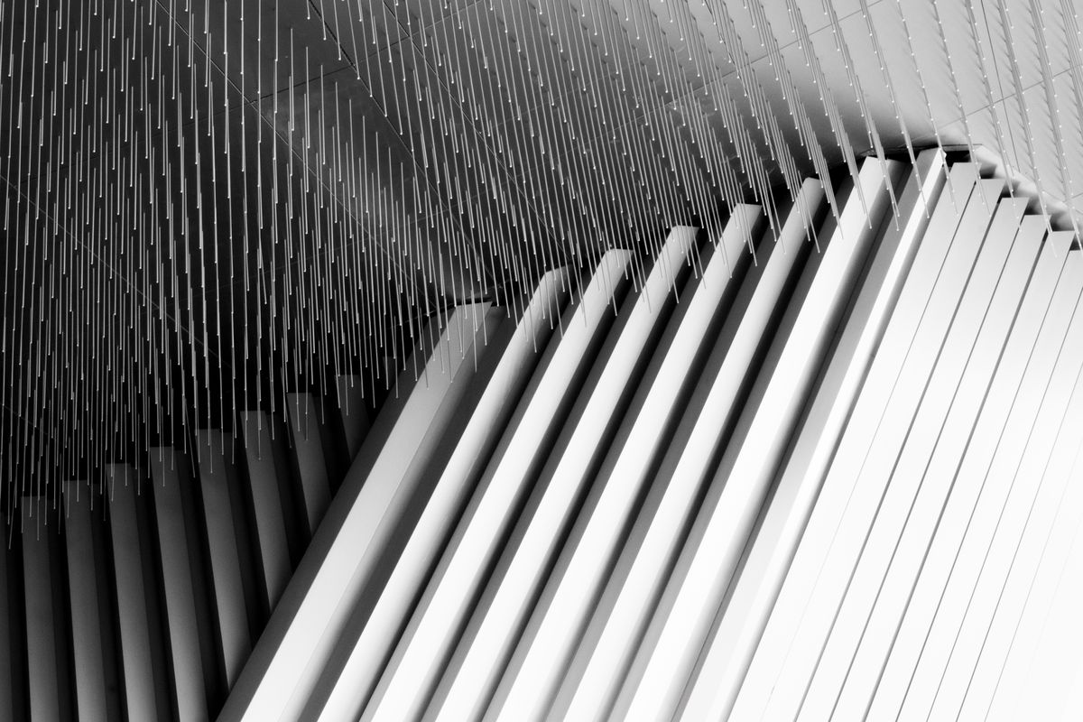 À l’intérieur, un immense hall entouré de lignes, d’ombres et de lumières, un plafond rempli de piquants illuminés de petites leds sur toutes les extrémités.
